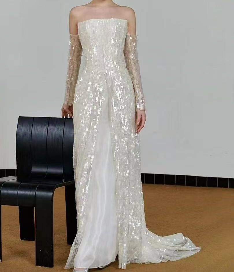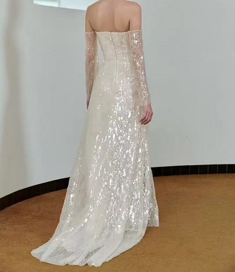 Appearance:Adorned with an abundance of sparkling sequins, it creates a dazzling visual effect. The sequins are meticulously arranged, catching and reflecting light from every angle, giving the fabric a glamorous and eye – catching look. The long sleeves part is semi – sheer, with a fine mesh structure that adds an element of elegance and mystery.