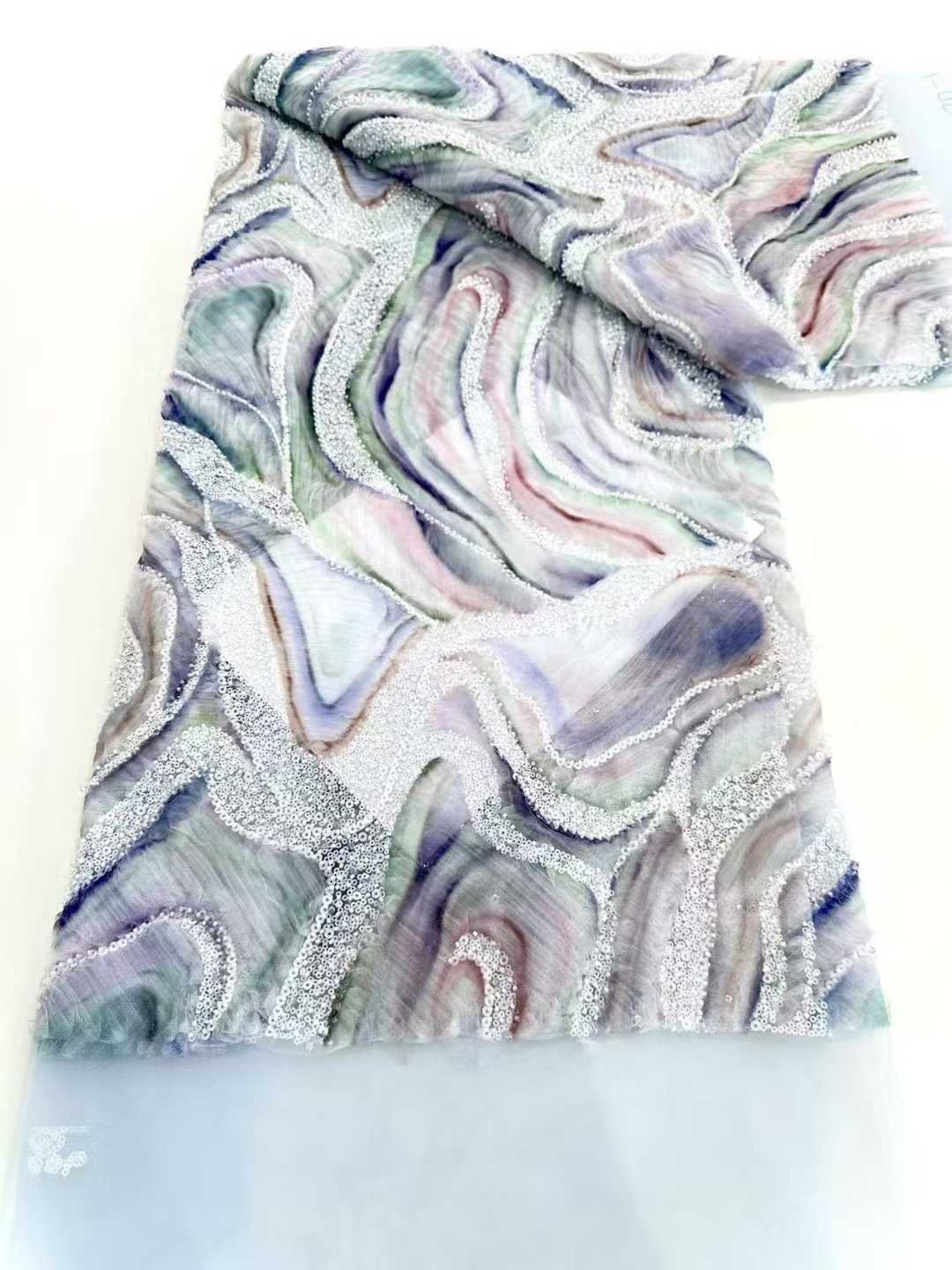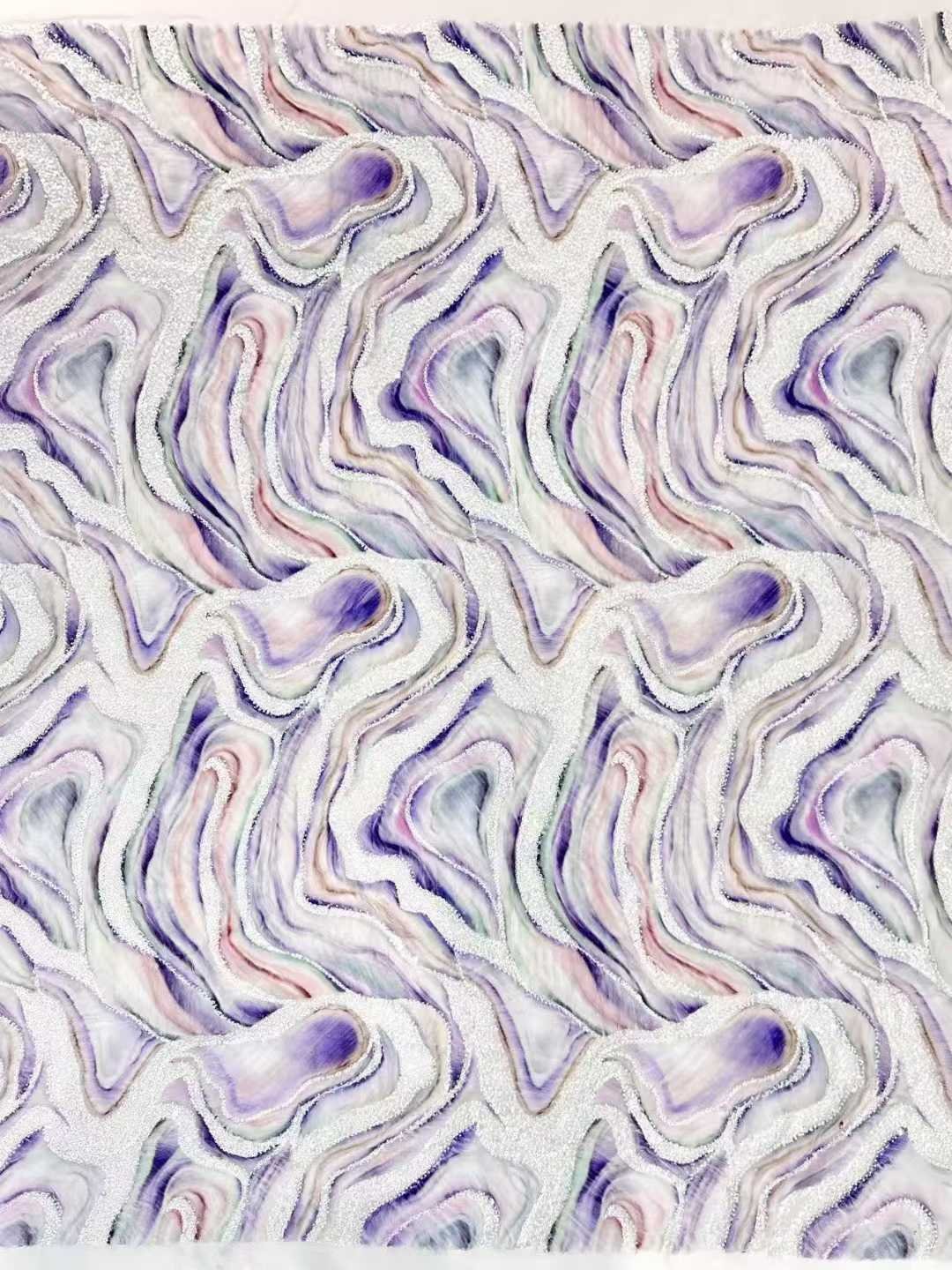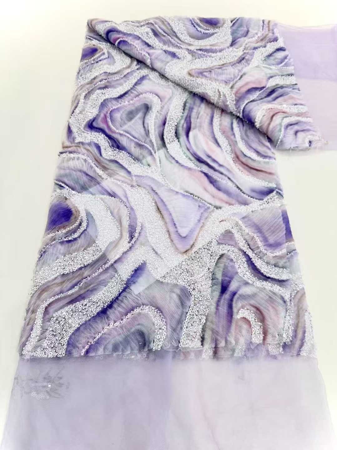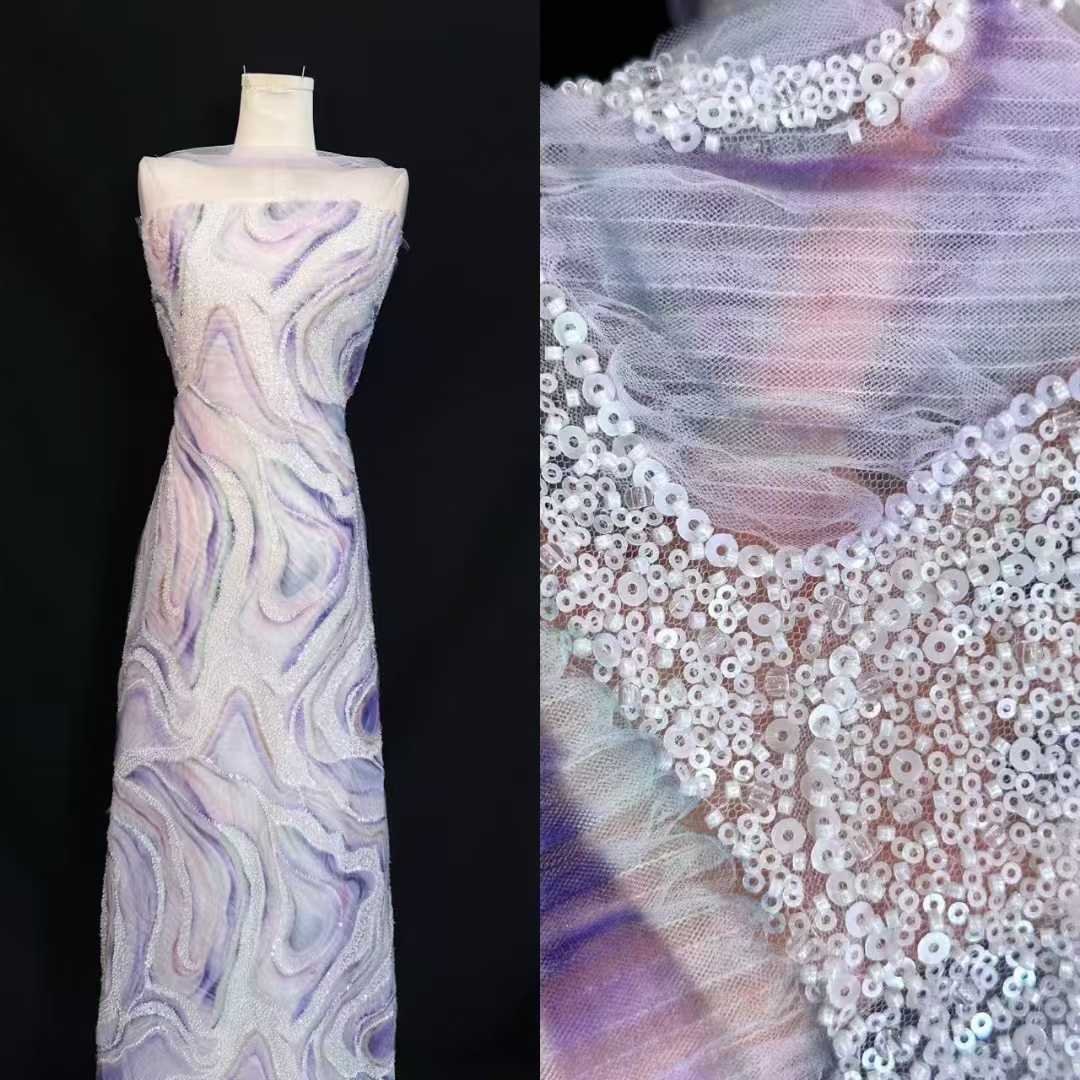 Purple Pearl Embroidery Lace with contrast textures. Modern fabric manipulation technique. Fashion-forward designs.