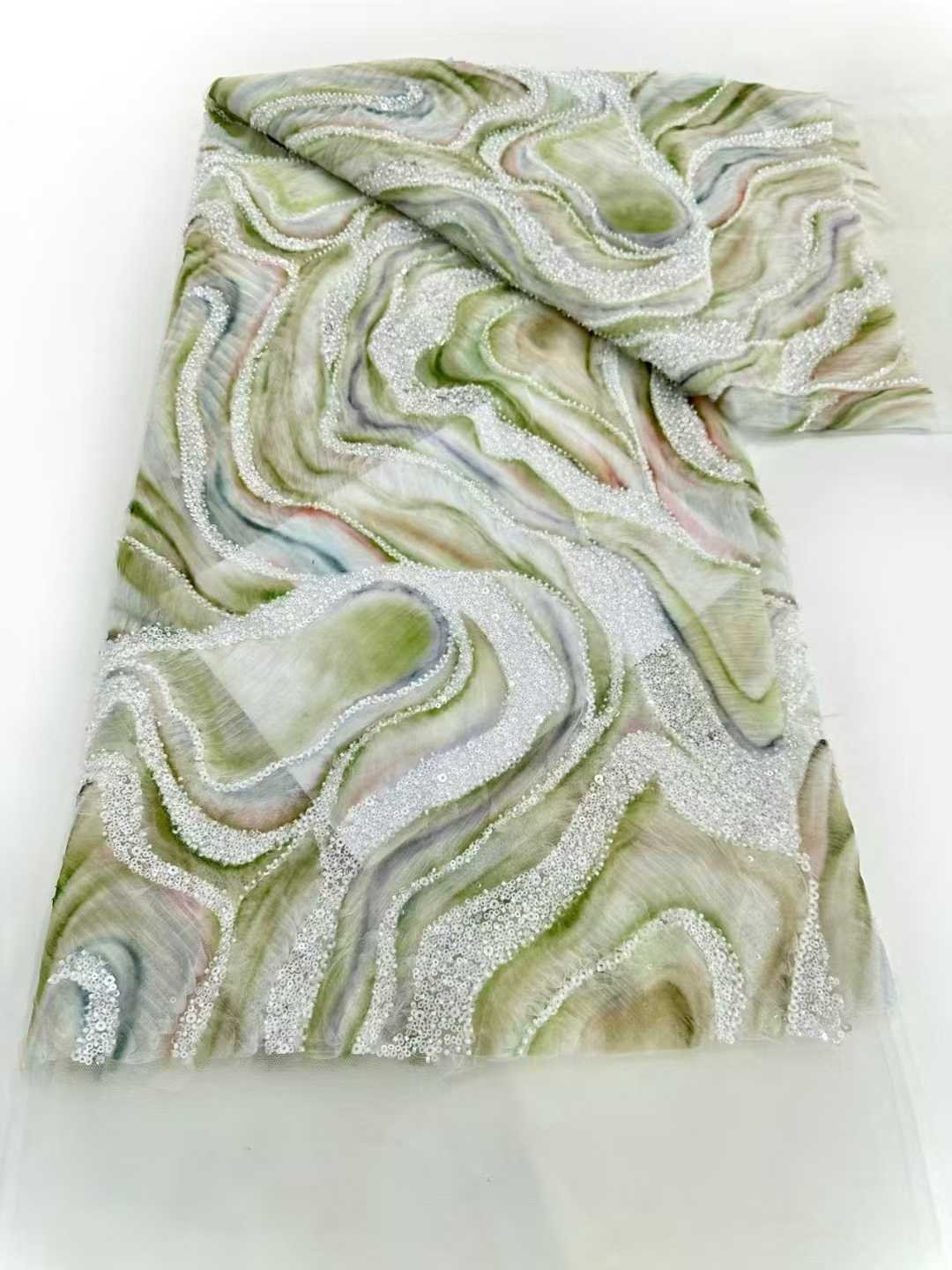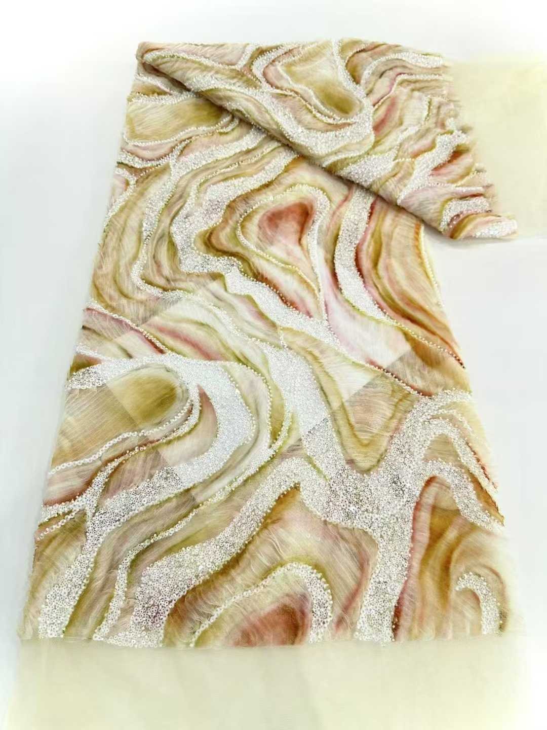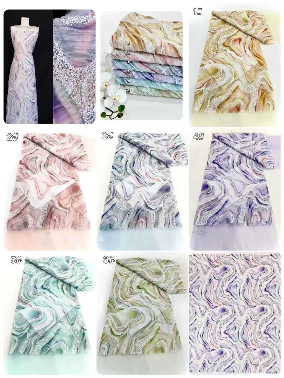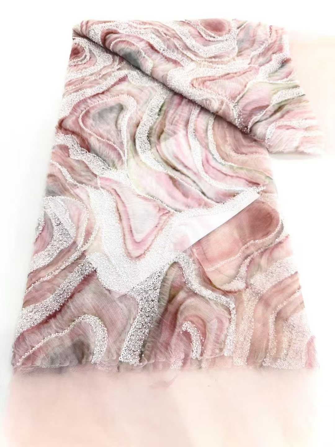 Purple Pearl Embroidery Lace with contrast textures. Modern fabric manipulation technique. Fashion-forward designs.
