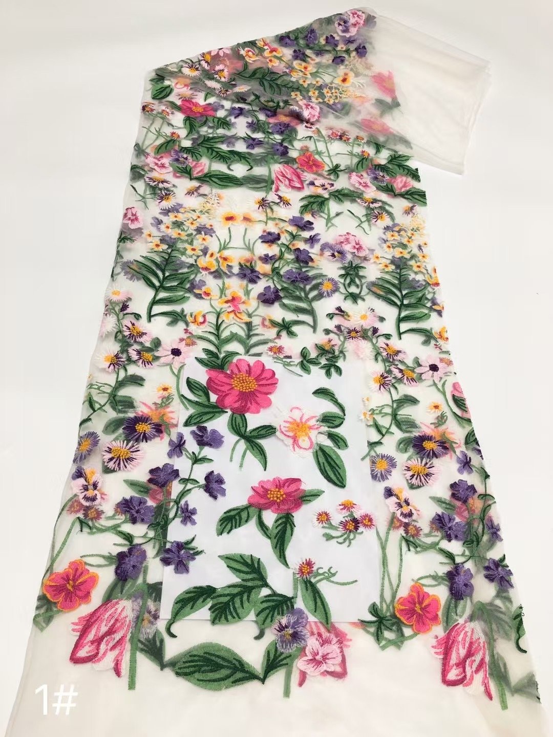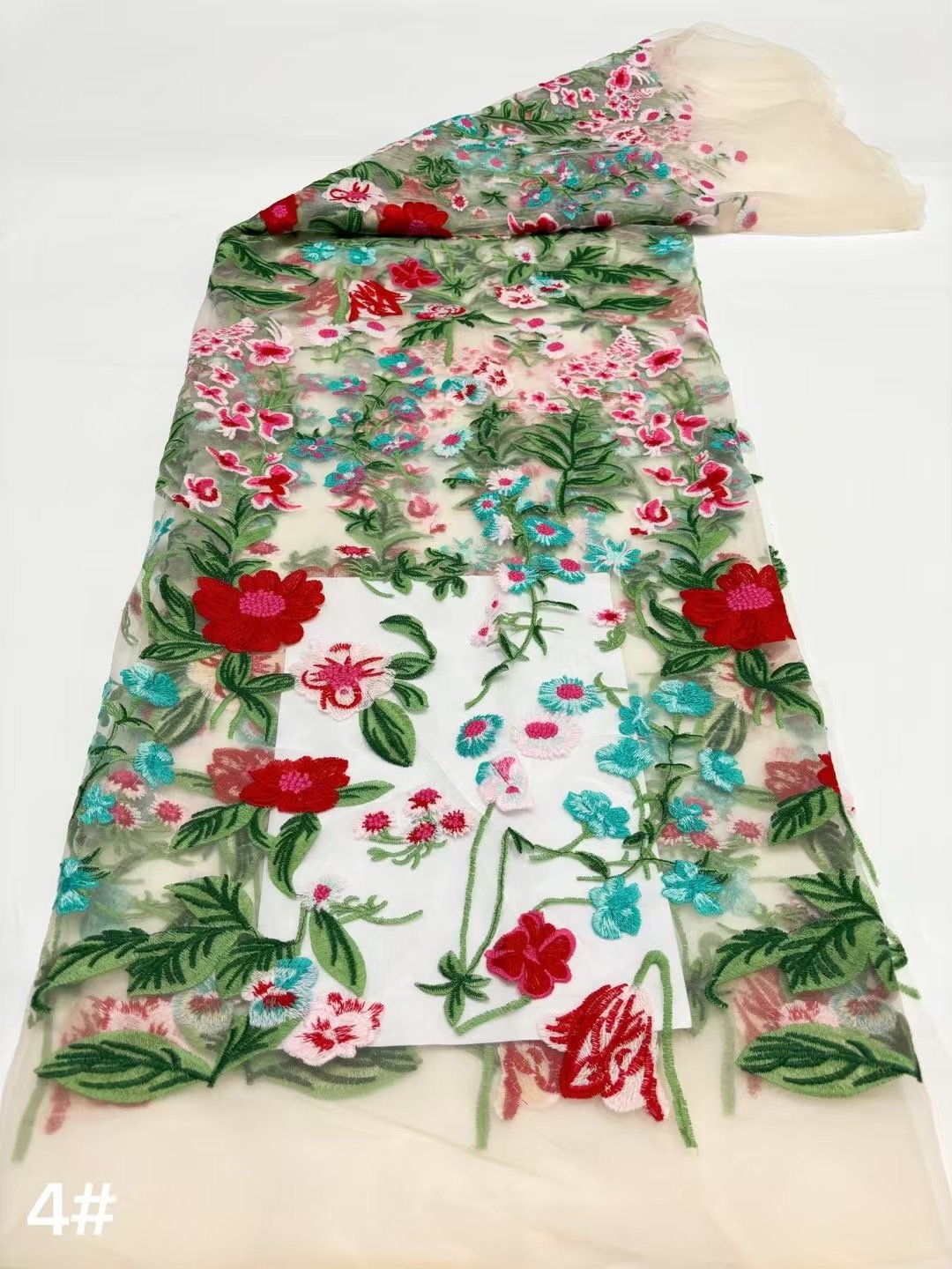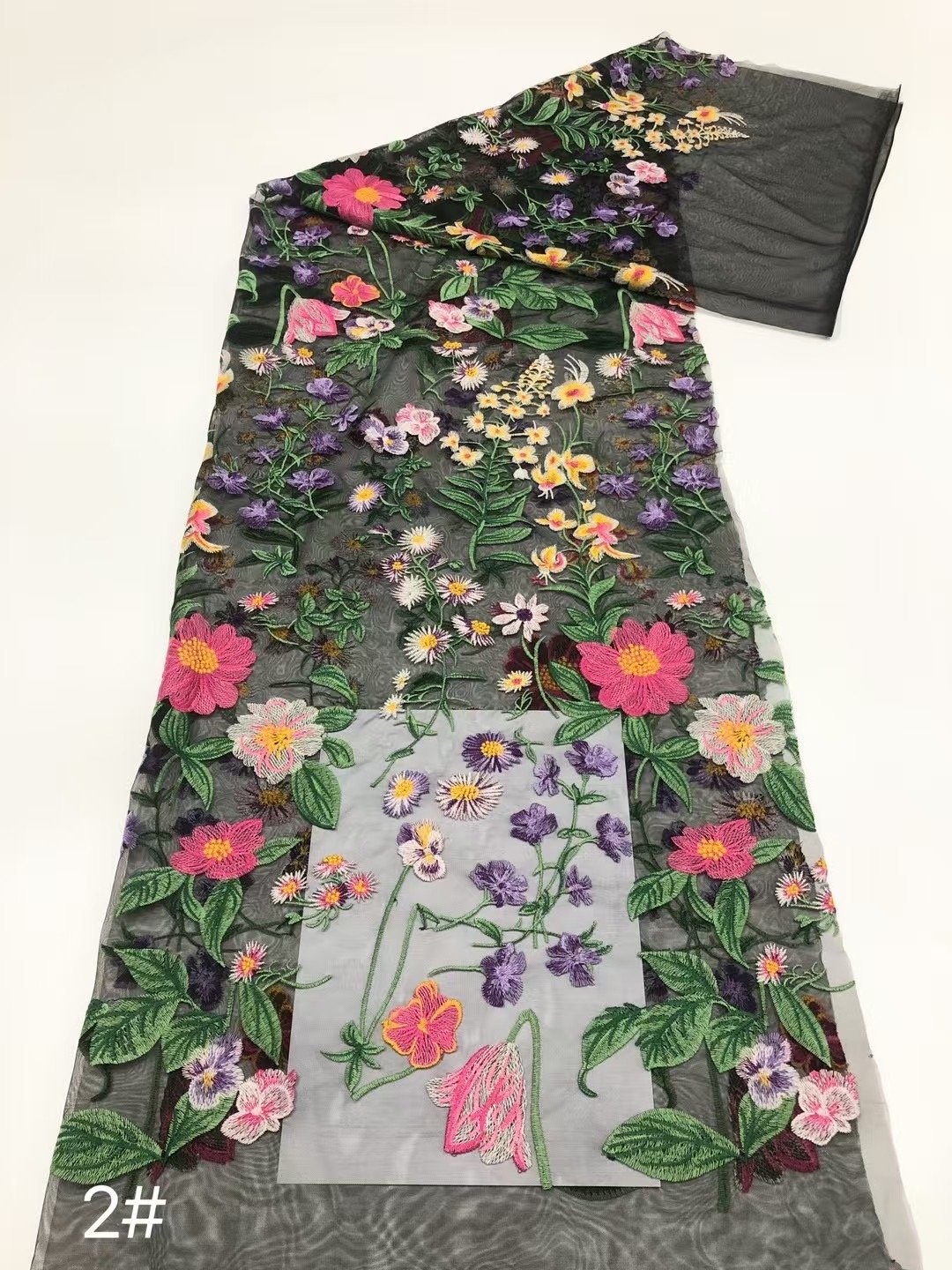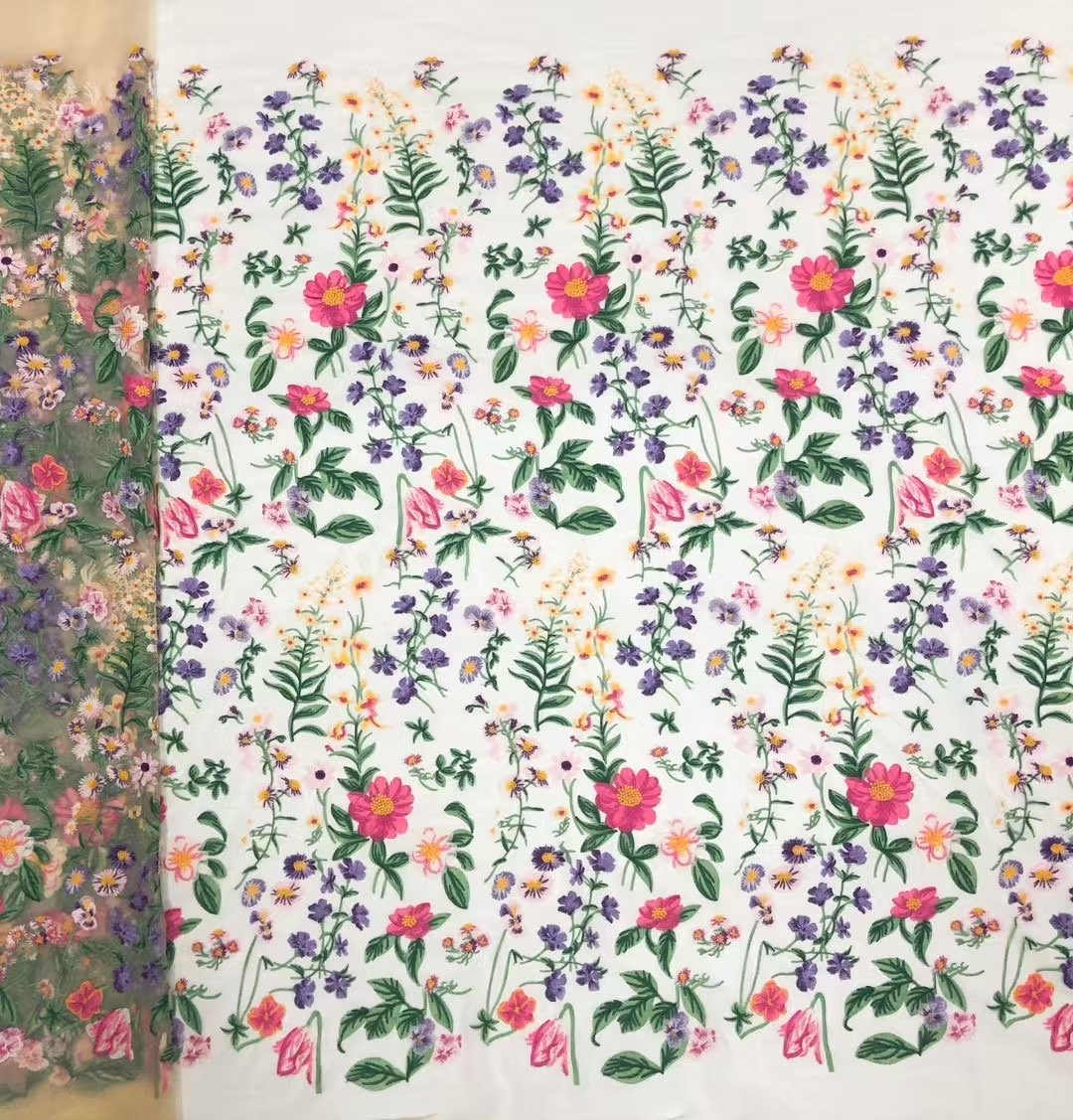 This fabric flaunts an intricately exquisite floral embroidery meticulously crafted on a delicate lace base. Every stitch of the flowers and leaves exudes elegance and sophistication