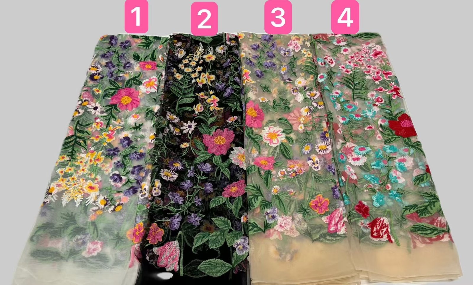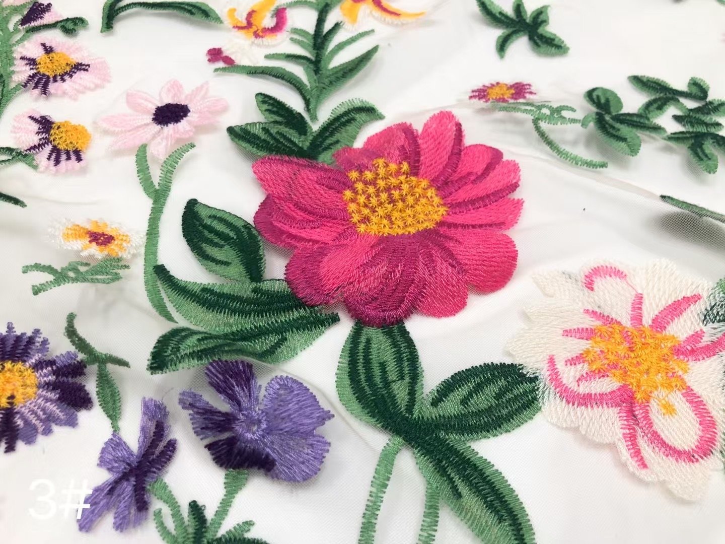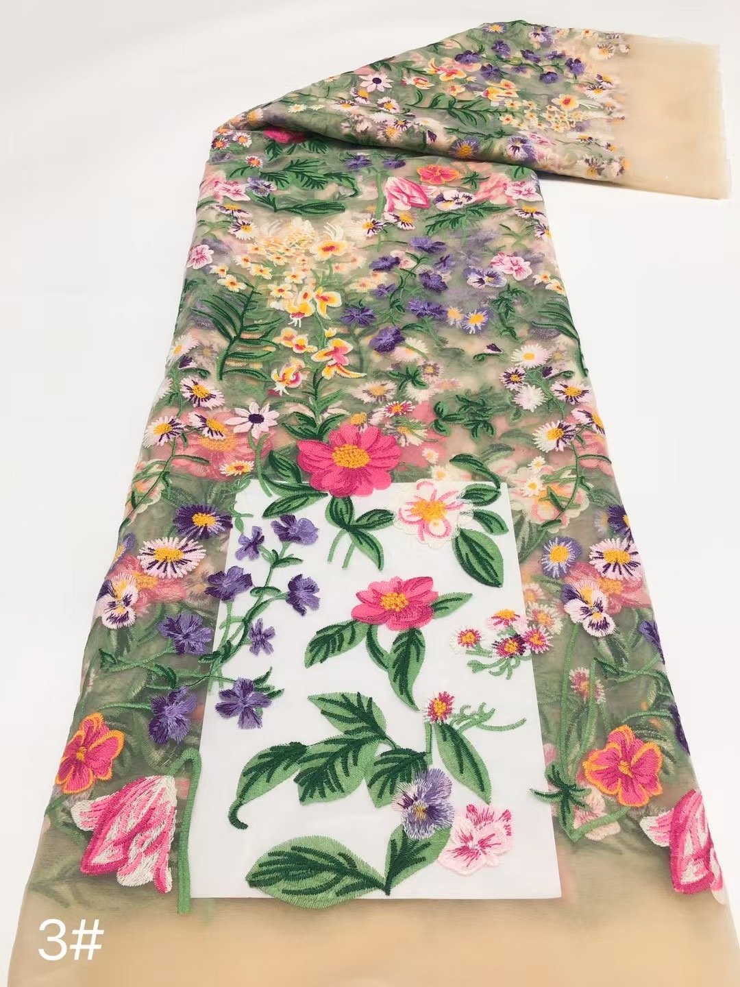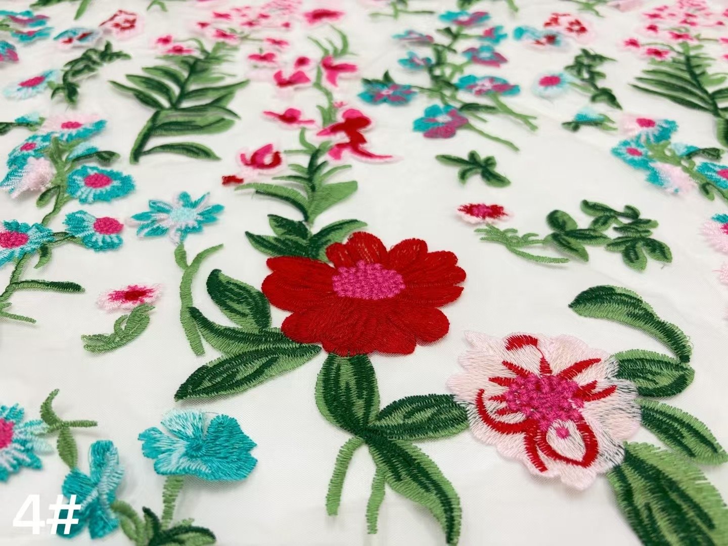 This fabric flaunts an intricately exquisite floral embroidery meticulously crafted on a delicate lace base. Every stitch of the flowers and leaves exudes elegance and sophistication