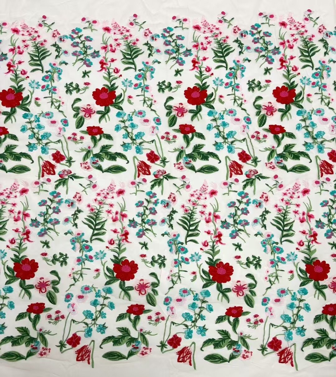 The vibrant and charming color palette of red, blue and green makes the floral motifs pop, creating a visually captivating effect